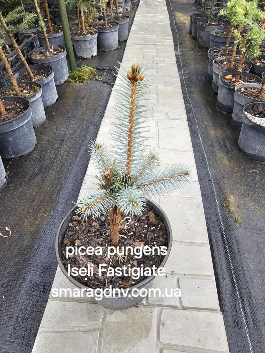 Picea pungens Iseli Fastigiate — це вузькоколоноподібна форма колючої ялини з щільною структурою та насичено-сріблясто-блакитною хвоєю. Сорт ідеально підходить для вертикальних акцентів у ландшафтному дизайні, завдяки своєму строгому силуету. Зберігає правильну форму без обрізки, не розростається в ширину, що робить її незамінною для невеликих садів або композицій із чіткою архітектурною геометрією.